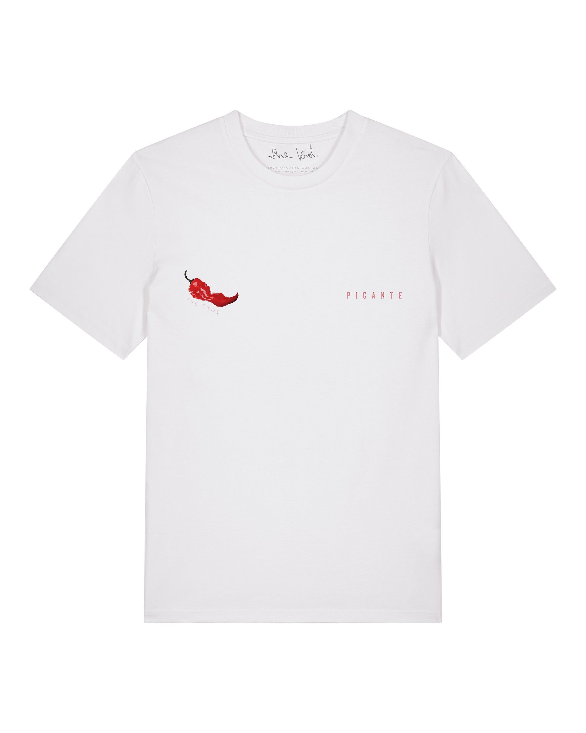 With a blurred deep red chilli on the front and picante stamped side by side with water-based inks, this is a mid-weight 180g organic cotton tee in a classic regular fit, ring-spun for a soft feel.