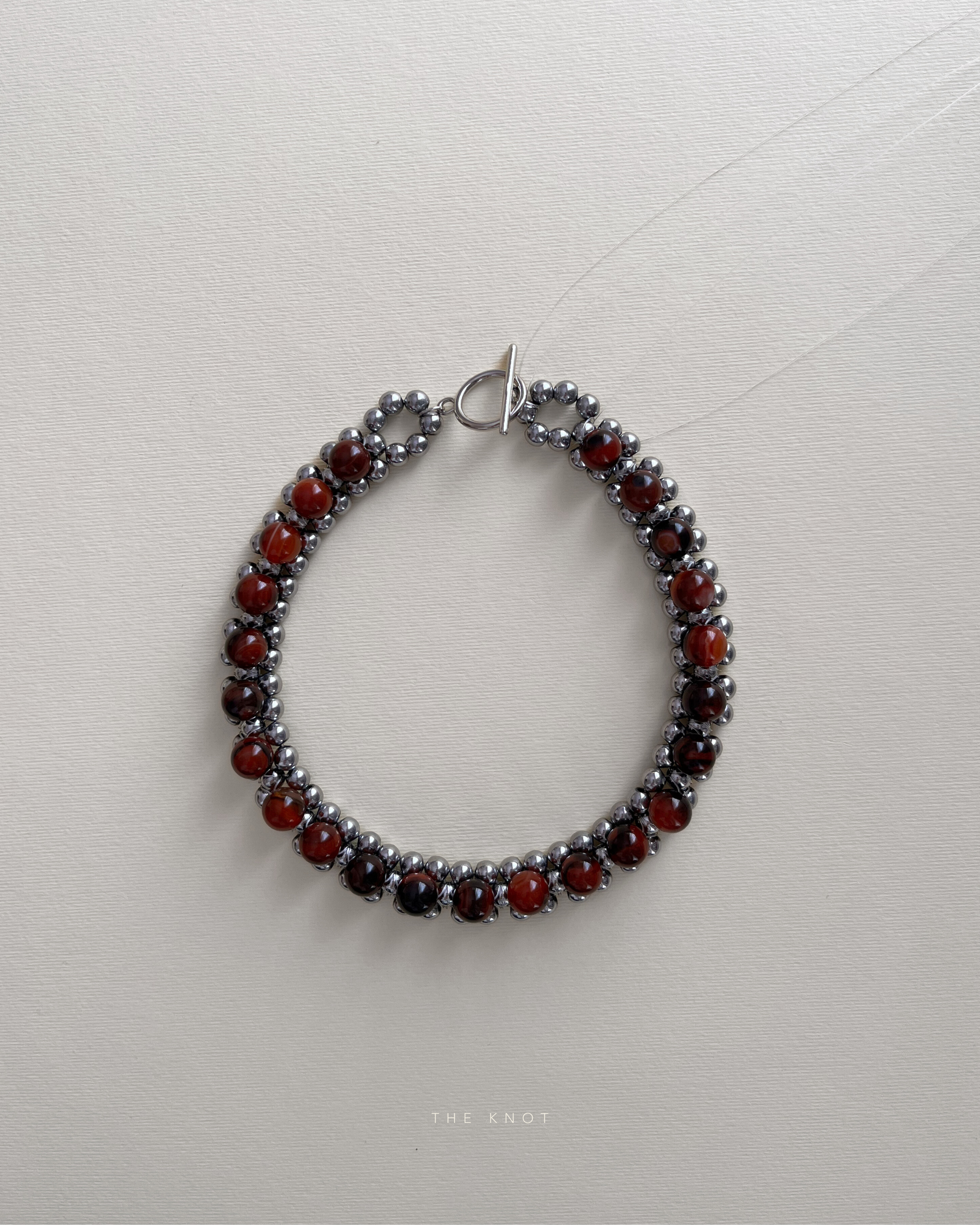 STRUNG D005 layers two kinds of semi-precious stones, threaded with precision and patience, and assembled bead by bead. Silver hematite —an iron oxide settled over time, and whose root means blood— forms the base layer. Above it, red striped agate —a layered stone for layered times— brings variation. Each bead unique, shifting from tea tones to deep rust and oxblood. One stone to empower, one to energise.