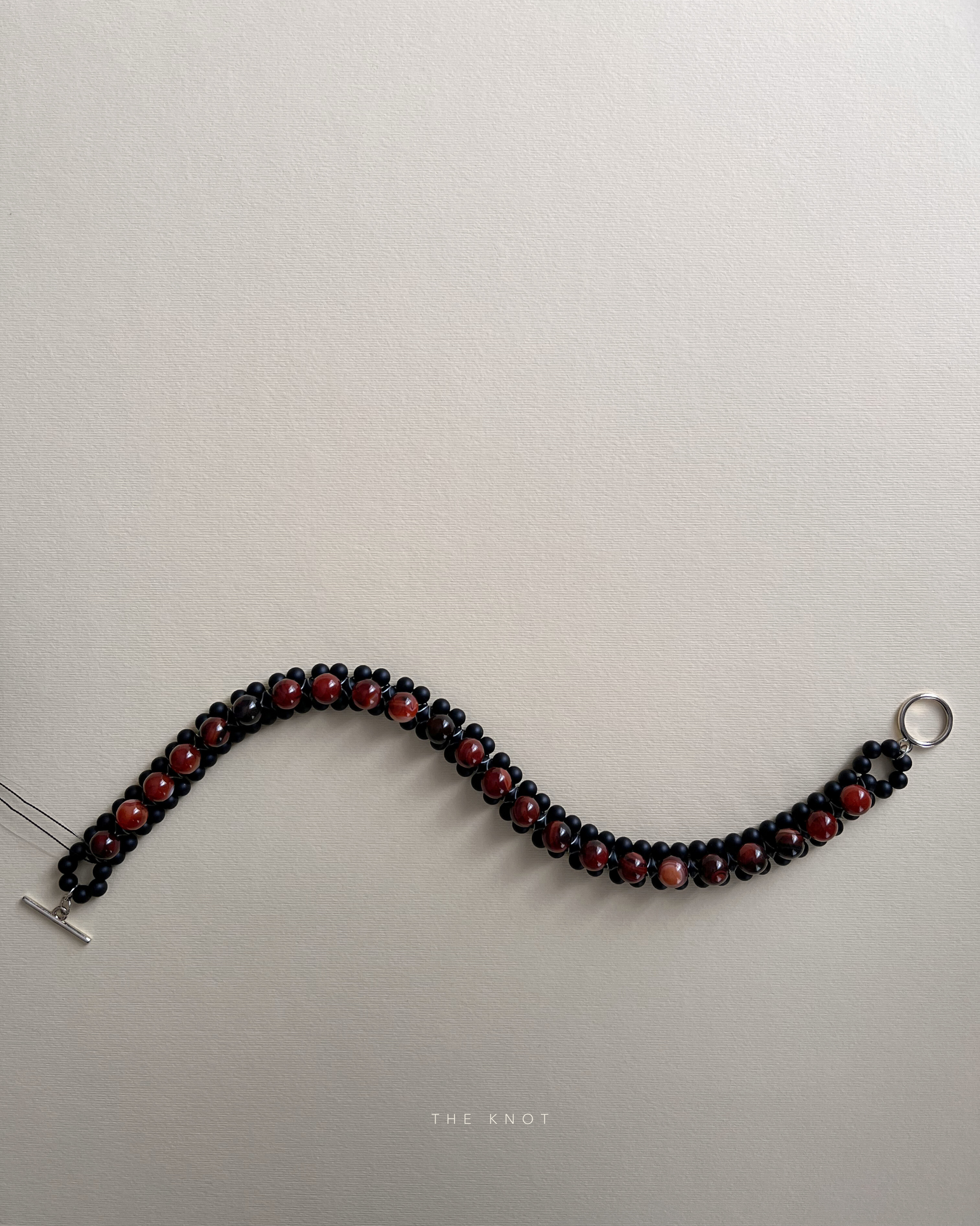 Hand-beaded with a steady rhythm of black matte agate and warm red striped agate, this necklace holds contrast with quiet confidence.