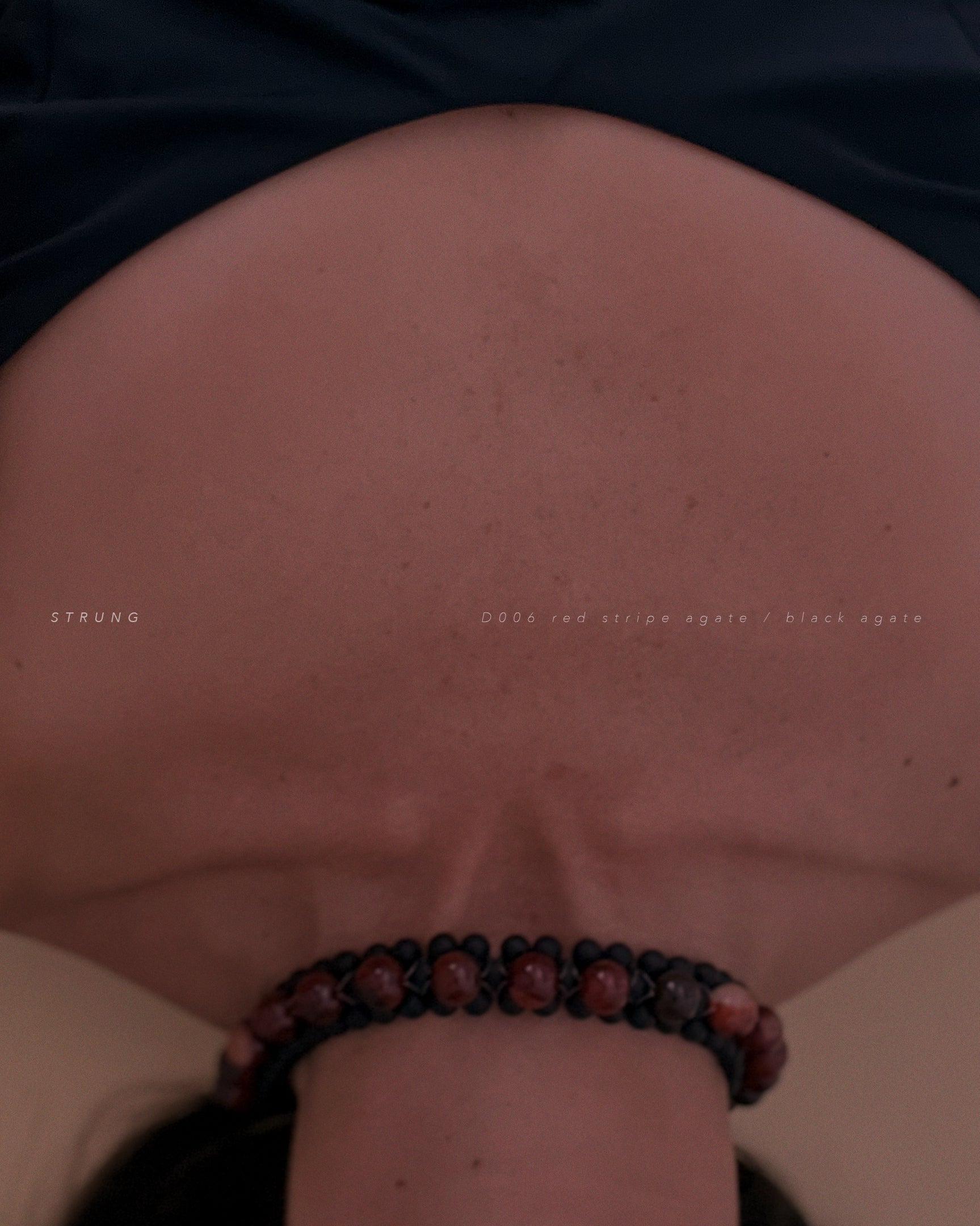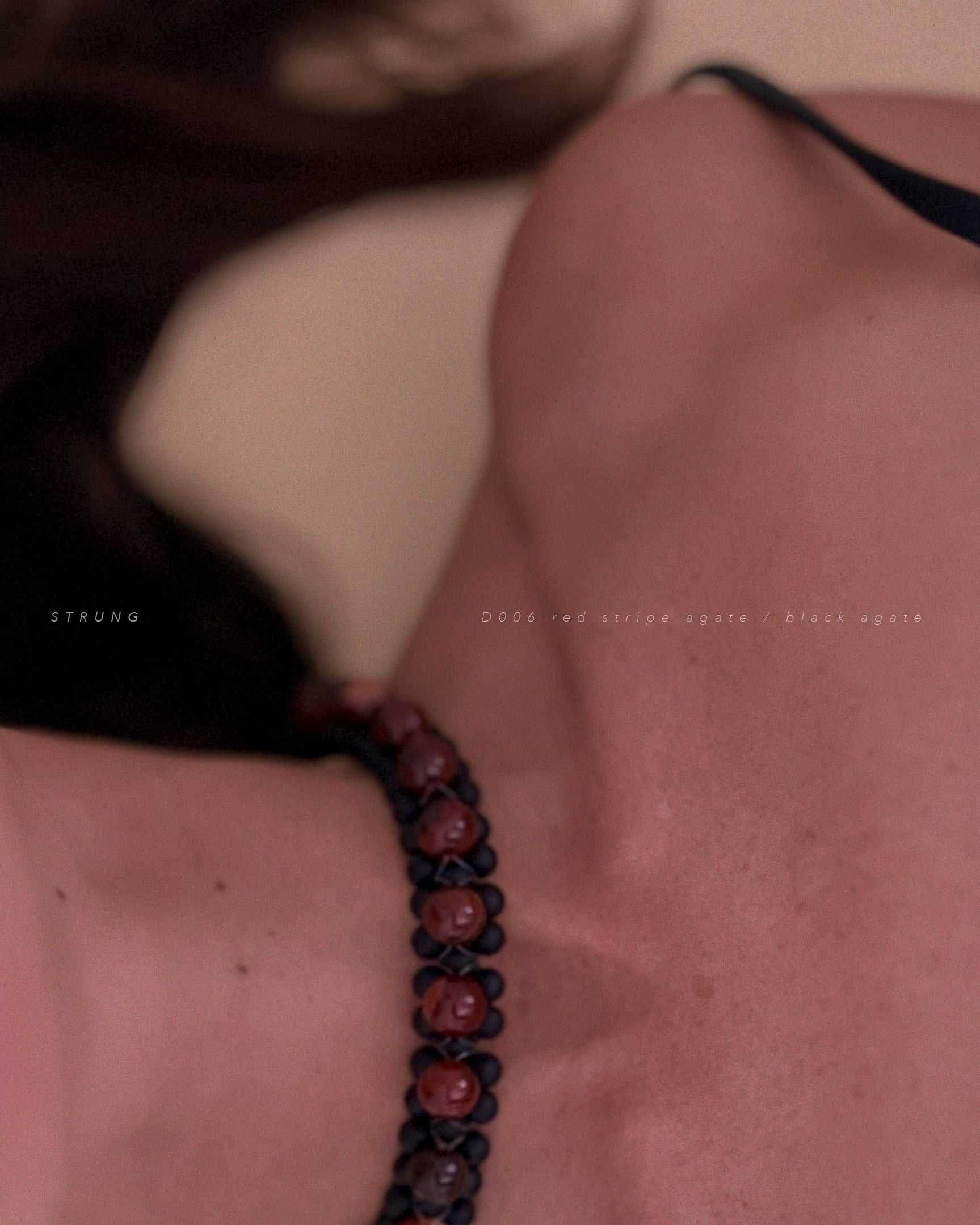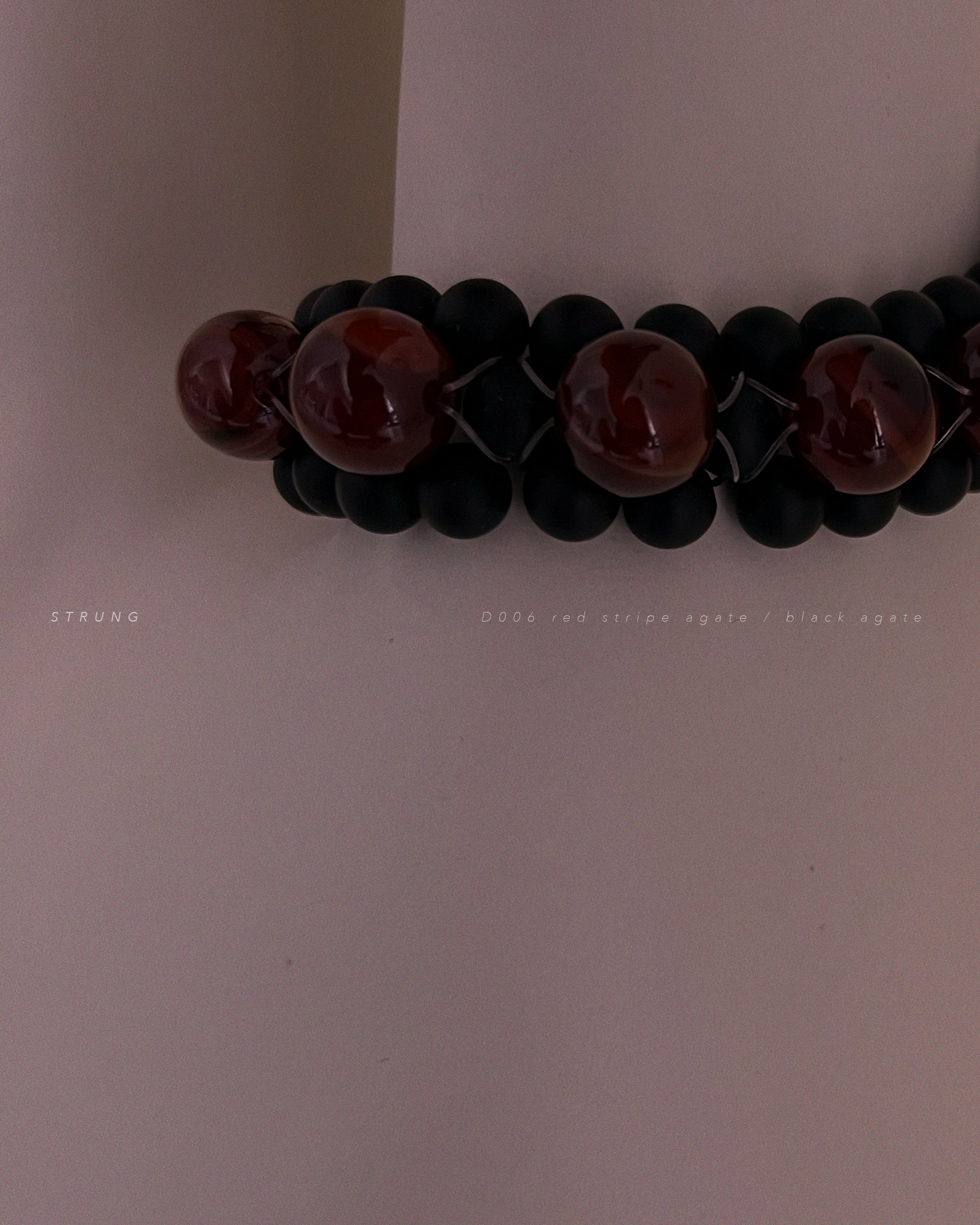 STRUNG D006 layers two kinds of semi-precious stones, threaded with precision and patience, and assembled bead by bead. Black matte agate —a form of chalcedony with a smooth, almost velvety matte surface obtained through an oil treatment— forms the base. Above it, red striped agate —a layered stone for layered times— brings variation. Each bead unique, shifting from tea tones to deep rust and oxblood. One stone to centre, one to energise.