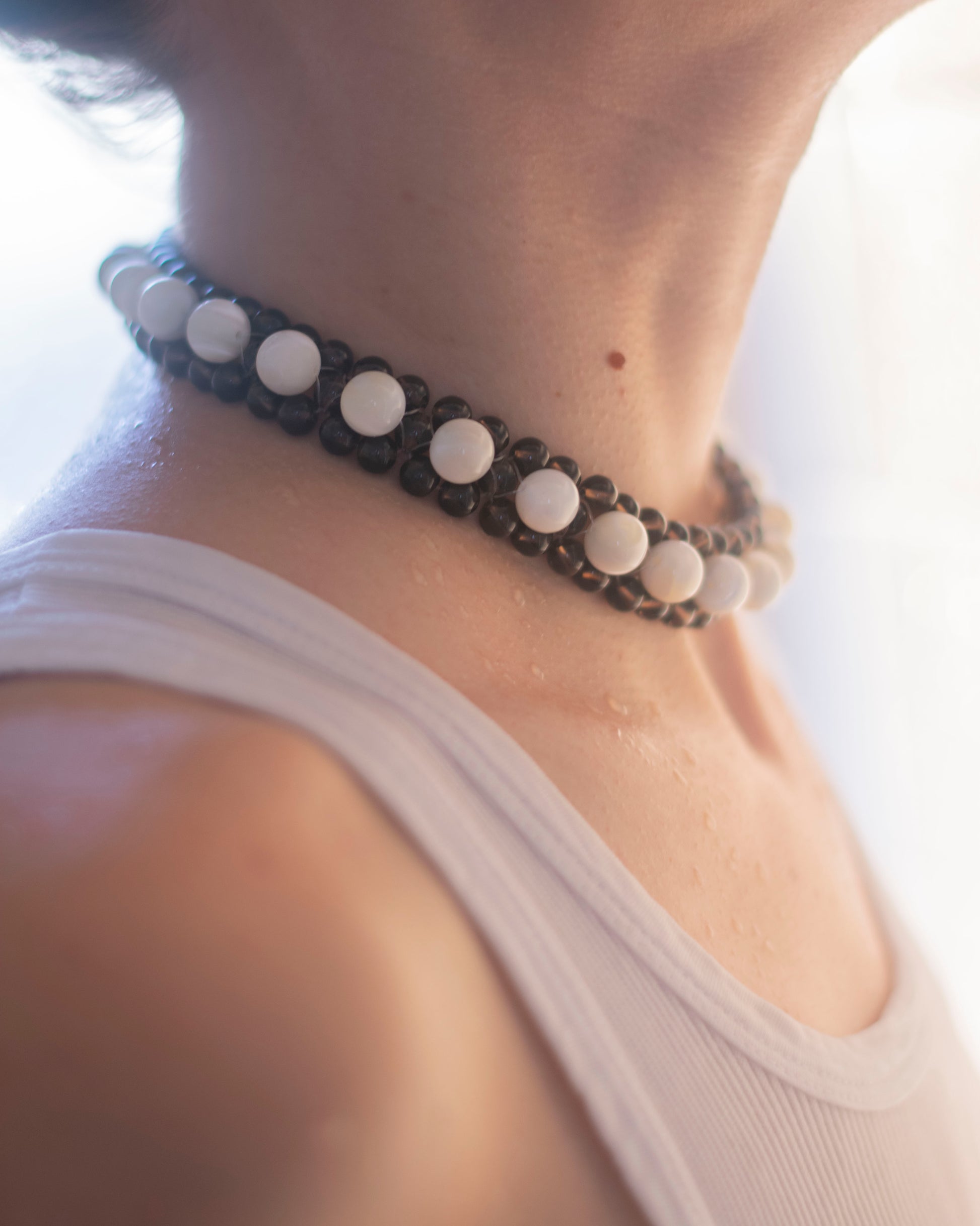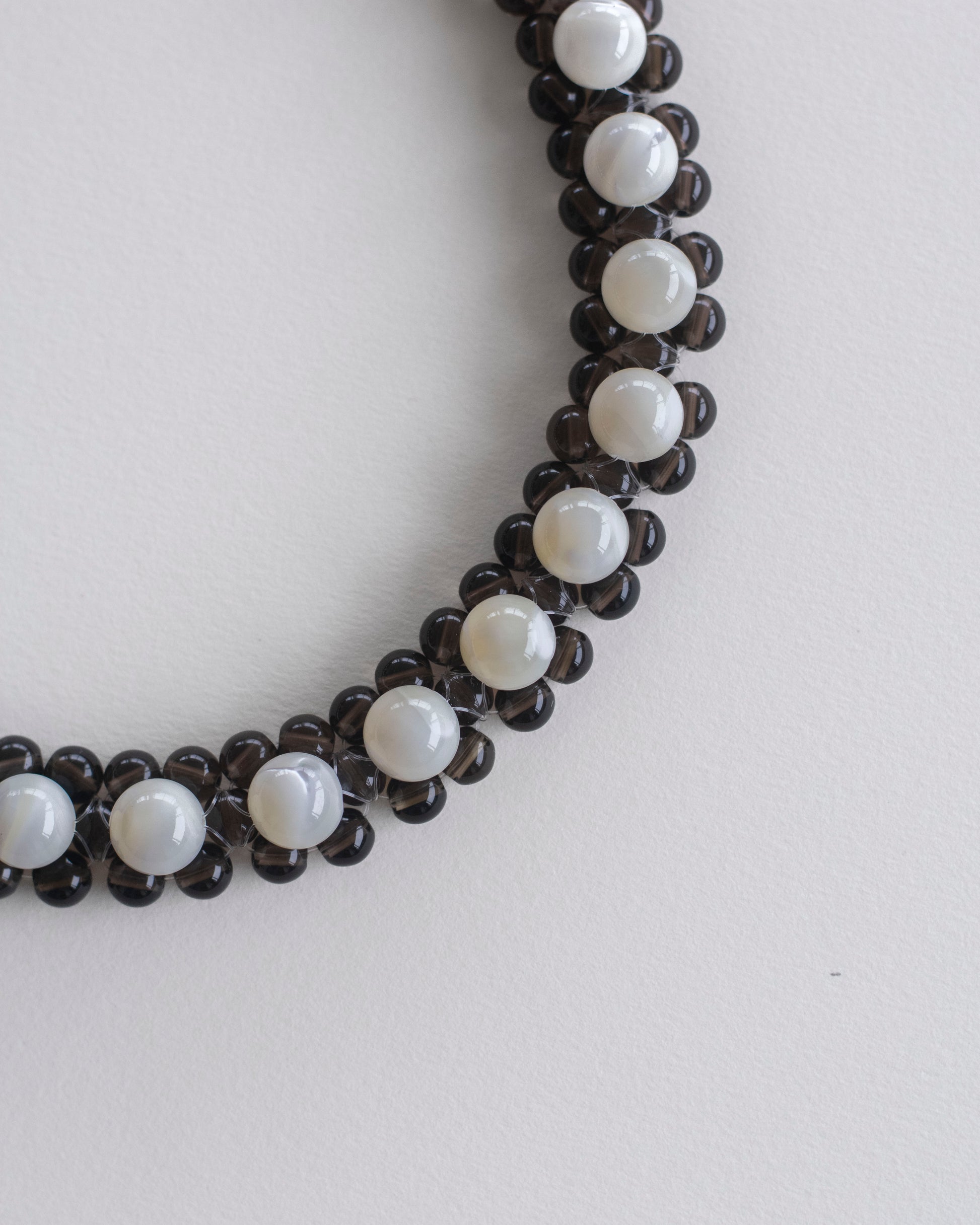 Two bead sizes create a subtle tension in scale — 184 stones assembled one by one, without shortcuts. Smoky quartz carries a refined translucence, allowing light to pass through its brown-grey tone; mother of pearl introduces a pale nacreous shimmer above. Together, they create a layered play of depth and glow — warm, composed, and defined by contrast.